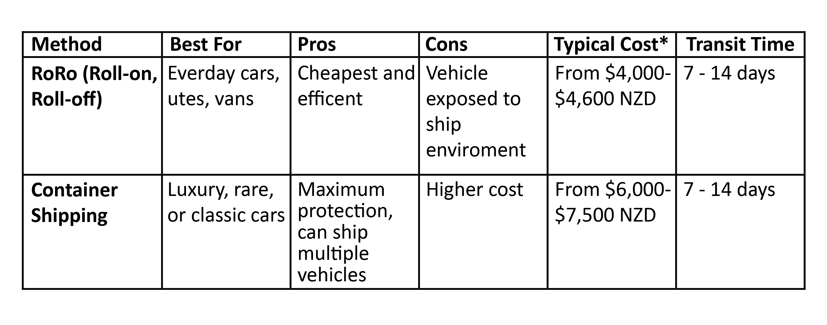 What is the cost of shipping a car? From around $4,000 NZD for RoRo, plus customs fee, GST, and duty.